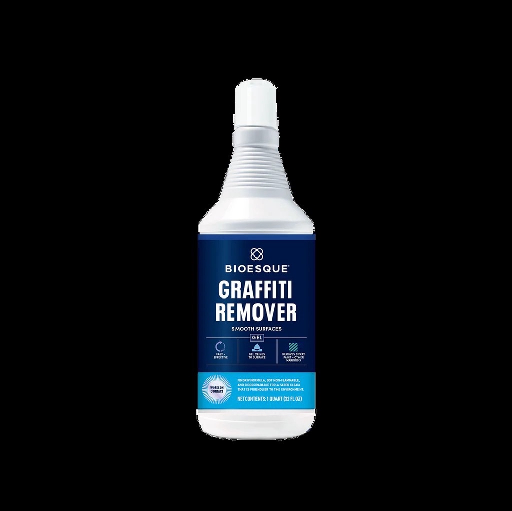 Bioesque Solutions Graffiti Removers are based on unique biodegradable gels which cling to surfaces to effectively remove unsightly markings without the hazardous chlorinated solvents used in many products. Our environmentally friendly formulas contain bio-based solvents and surfactants that remove spray paint, permanent marker, lipstick, etc. Simply spray on marks, allow to penetrate, and wipe away. Our Graffiti Remover Gel is available in two options: Heavy Duty Graffiti Remover for Masonry and Porous Surfaces or Graffiti Remover Gel for Smooth Surfaces. The Graffiti Remover Gel for Smooth Surfaces can be used on all types of metals, glass, porcelain, and many painted surfaces. It’s perfect for doors, fences, lockers, bathrooms, signs, siding, and more. Our Masonry Graffiti Remover may be used on all types of porous masonry surfaces, including, brick, concrete, stone, and stucco.